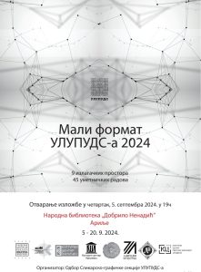 Народна библиотека “Добрило Ненадић” вас позива на отварање изложбе Мали формат УЛУПУДС-а која ће се одржати у четвртак 5. септембра 2024. године у 19 часова у Градској галерији Ариље.