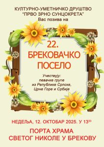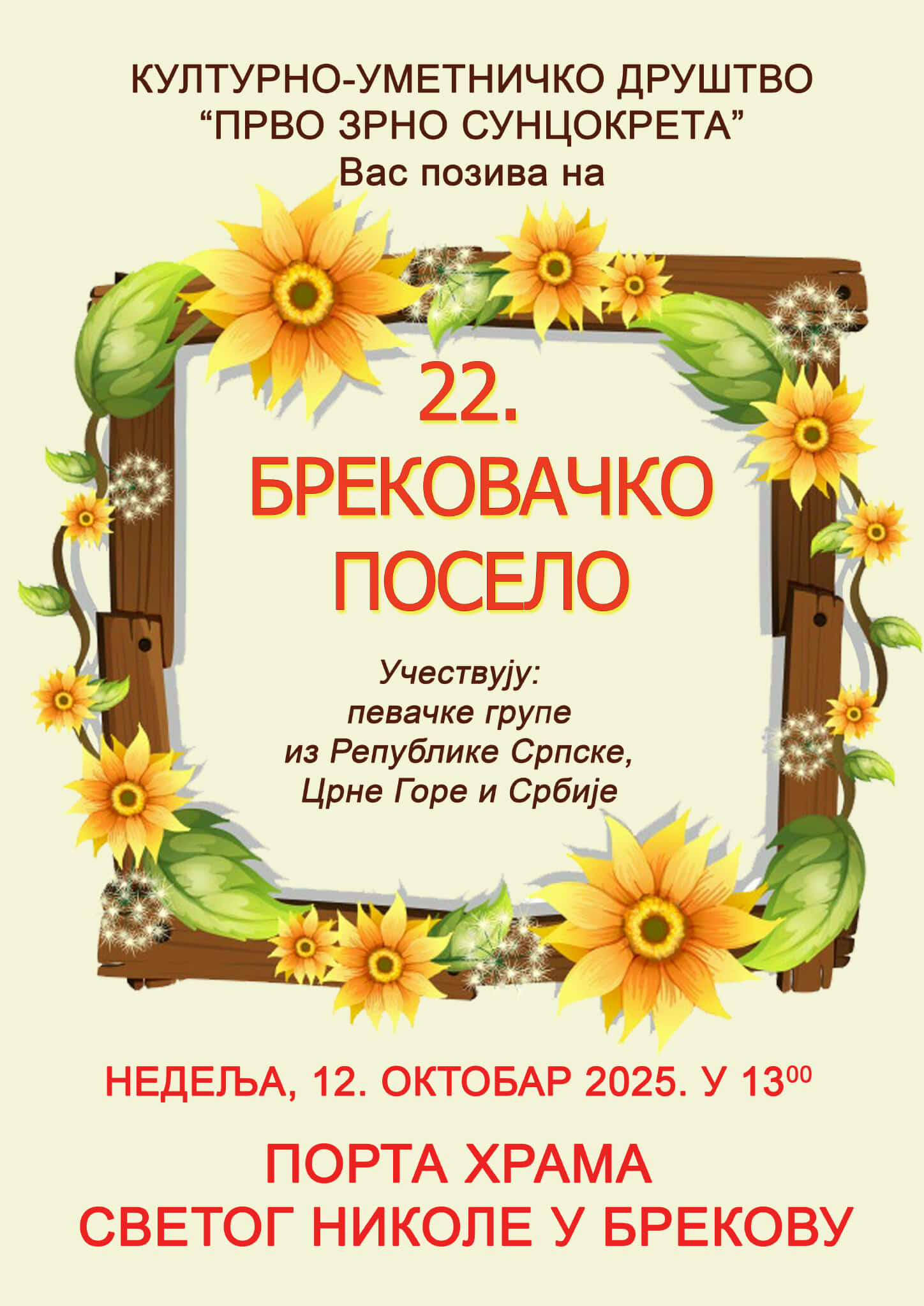 Културно – уметничко друштво “Прво зрно сунцокрета” вас позива на 22.по реду БРЕКОВАЧКО ПОСЕЛО у недељу 12.октобра 2025. године у 13 часова у порти Храма Светог Николе у Брекову.