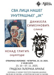Народна библиотека “Добрило Ненадић” вас позива на отварање изложбе СВА ЛИЦА НАШЕГ УНУТРАШЊЕГ “ЈА” , ауторке Данијеле Симеуновић ( слике ) и Ненада Глигића ( скулптуре ) у четвртак 23.10.2025. године у 19 часова у Градској галерији у Ариљу.