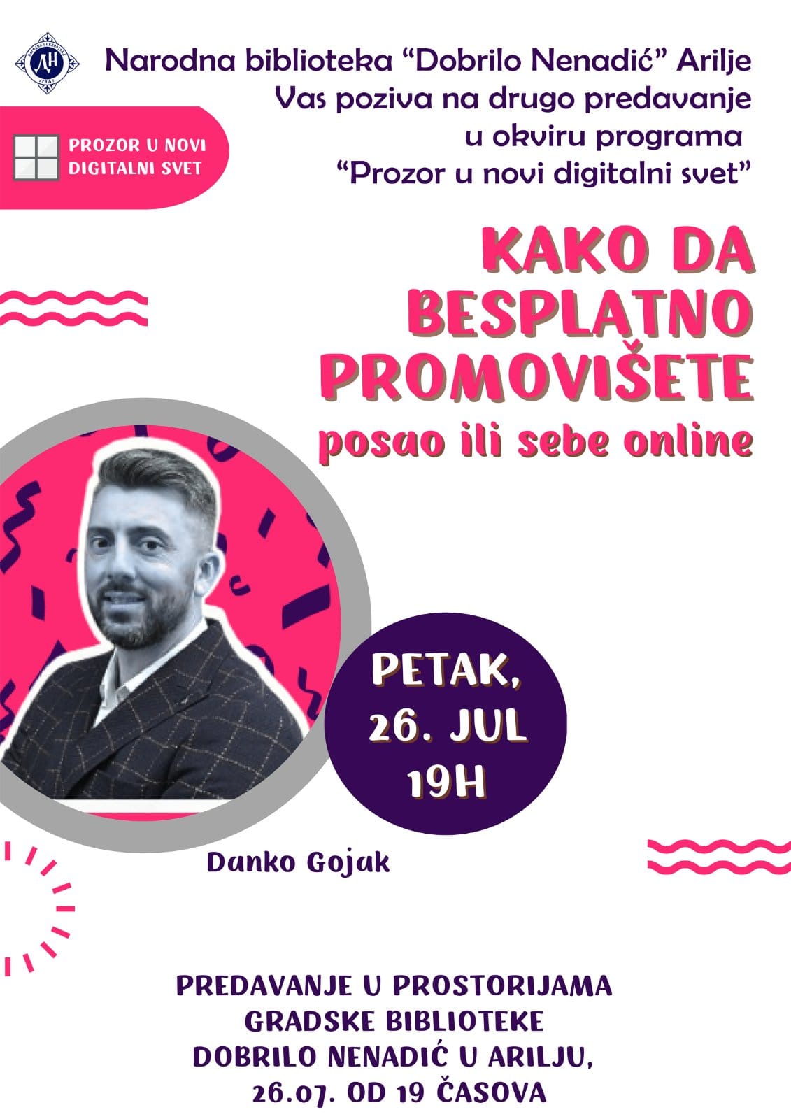 Програм „Прозор у нови дигитални свет“ одржан је 26.јула 19 сати у просторијама Народне библиотеке „Добрило Ненадић“ у Ариљу. Ово, друго по реду, предавање у оквиру поменутог програма, заинтересовало је присутне који су се, кроз интерактиван дијалог, бројне предлоге и сугестије, упознали са темом „Како да бесплатно промовишете посао или себе онлине“. Предавач је и...Прочитај