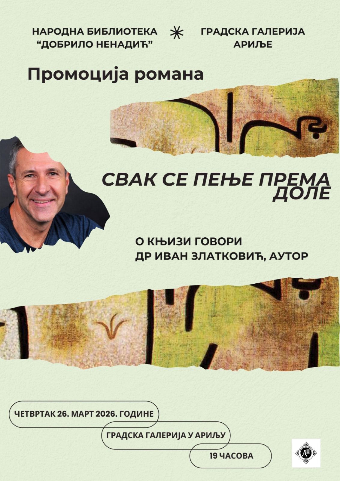 Народна библиотека “Добрило Ненадић” вас позива на промоцију романа “Свак се пење према доле” , аутора Ивана Златковића. Промоција ће се одржати у Градској галерији у Ариљу у 19 часова, у четвртак 26. марта 2026. године. У новом роману Ивана Златковића преплићу се митска, породична и политичка историја Србије, кроз симболику камена и лековите воде,...