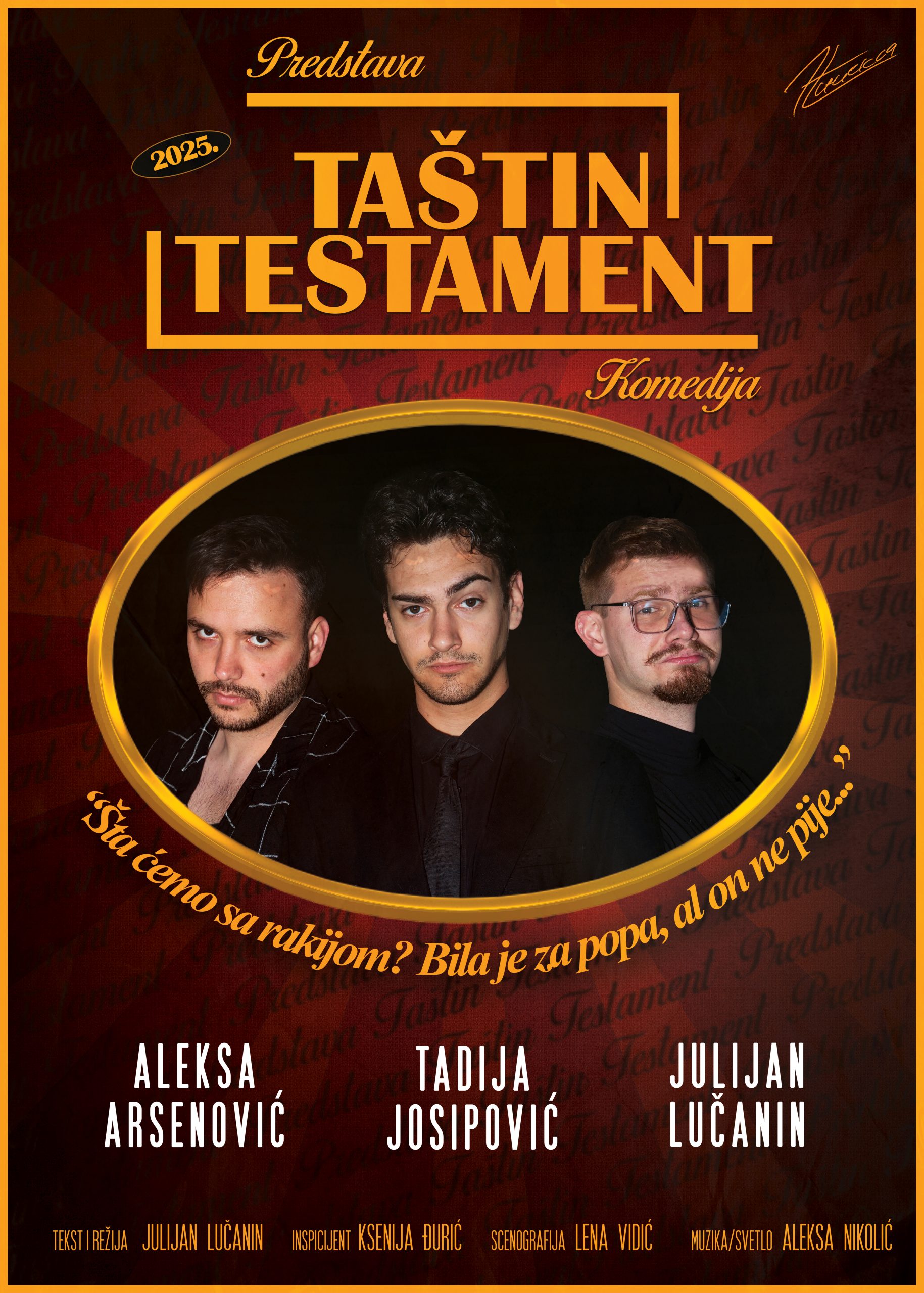 Narodna biblioteka ” Dobrilo Nenadić” vas poziva na pozorišnu predstavu “Taštin  testament” u sredu 01. aprila 2026.godine u 20 časova u Sokolskom domu . Ulaz besplatan. Predstava je autorska ,autorski tim čini kolektiv mladih profesionalaca, studenata umetničkih fakulteta u Beogradu, koji već ostvaruju zapažene rezultate na nezavisnoj sceni. Projekat je rezultat ozbiljnog autorskog, organizacionog i...